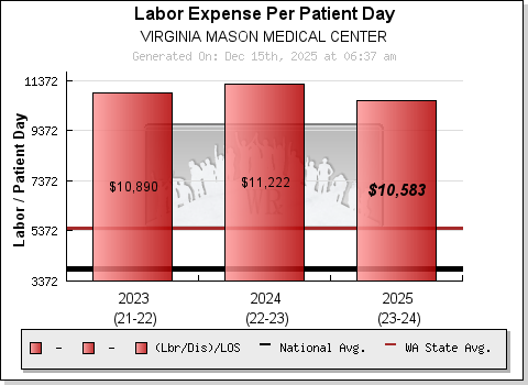 Changes in acuity are nearly always reflected in both "Length of Stay" (sicker patients tend to stay longer) and "Labor per Discharge" (sicker patients require more labor per day). Therefore, dividing the "Labor per Discharge" by the "Length of Stay", produces a scalable measure that truly captures an organization's change in labor utilization (against volumes) over time. The measure is "automatically" acuity adjusted and tells a far more detailed story than any other single risk factor (See section above).