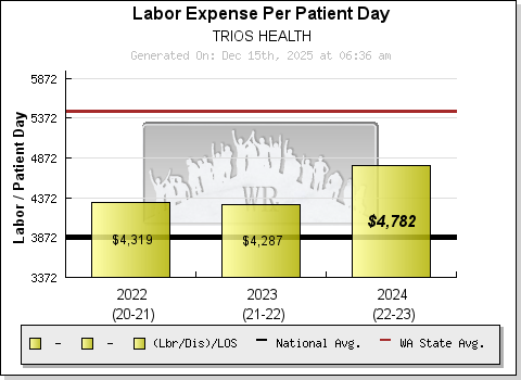 Changes in acuity are nearly always reflected in both "Length of Stay" (sicker patients tend to stay longer) and "Labor per Discharge" (sicker patients require more labor per day). Therefore, dividing the "Labor per Discharge" by the "Length of Stay", produces a scalable measure that truly captures an organization's change in labor utilization (against volumes) over time. The measure is "automatically" acuity adjusted and tells a far more detailed story than any other single risk factor (See section above).
